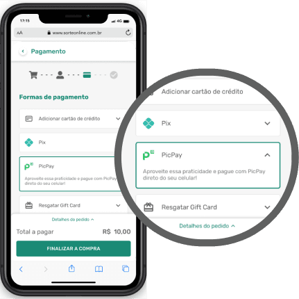 Para efetuar pagamentos com o PicPay, basta selecionar essa opção na hora de concluir suas apostas. Você será redirecionado ao aplicativo para concluir a transação.