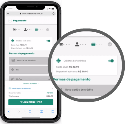 Dentre as formas de pagamento disponíveis, você tem a opção de usar os Créditos Sorte Online, que são adquiridos antecipadamente. Por meio desta opção, o usuário tem suas apostas confirmadas imediatamente, inclusive fora do horário comercial. Para a aquisição de Créditos Sorte Online podem ser utilizadas todas as demais formas de pagamento aceitas no site. Para pagar sua aposta com seus créditos, basta escolher seus jogos de valor menor ou igual ao crédito e selecionar essa opção como forma de pagamento ao final de sua compra.